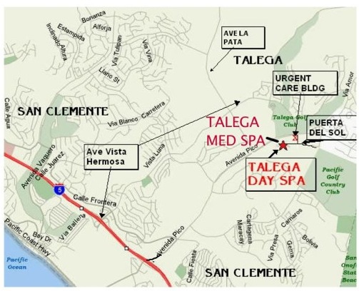 FROM SAN DIEGO: Take the Interstate 5 FWY NORTH. Go past Carlsbad and Camp Pendleton Marine Base. When you see the exits for San Clemente, take the Avenida Pico exit, and turn right, away from the ocean. Travel about 3 miles into the community of Talega, past Avenida La Pata. Turn right on Vista Hermosa when you see the Urgent Care Center. Take Vista Hermosa until it ends, turn right into the Makena Office Plaza. Talega Med Spa is in the back parking lot next to Aesthetic Dental, inside Talega Day Spa.